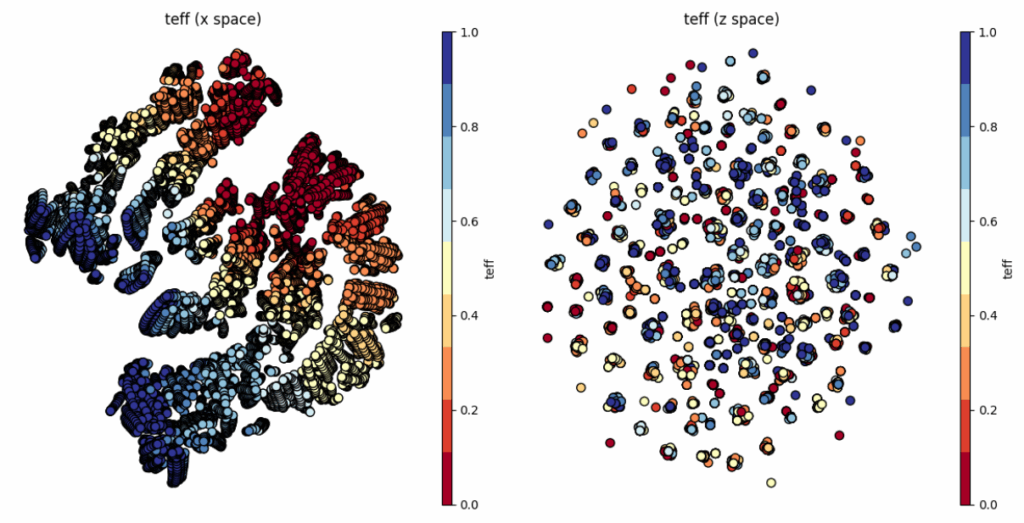 The image above shows the results of applying t-SNE, a non-linear dimensionality reduction technique used for visualizing high-dimensional data. This algorithm can be applied to the spectra and the corresponding latent spaces to assess the level of disentangling. The t-SNE representation from an experiment which attempts to eliminate effective temperature (Teff) in shown in the figure. On the left is the representation of the spectra, x space, where they are grouped according to their temperature. On the other hand, on the right is the latent space, z space, with the unsorted data.