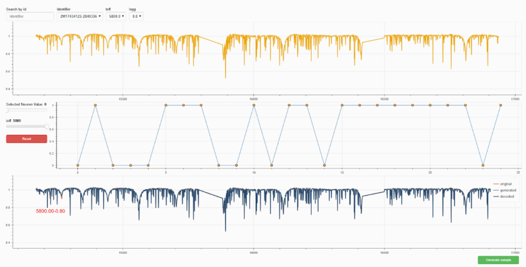 Although GANDALF was originally developed for use with spectral data, it can be applied to any type of data. The figure shows the interactive visualiser that was built using Bokeh. This allows us to view the representations of the input spectra and reconstruct them with new values for their parameters. You can read more about this tool and the scientific discoveries made using it in this paper: https://www.sciencedirect.com/science/article/pii/S1568494625002650